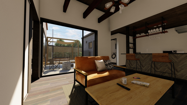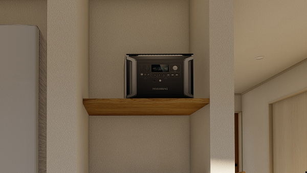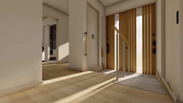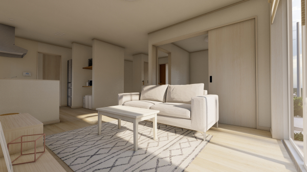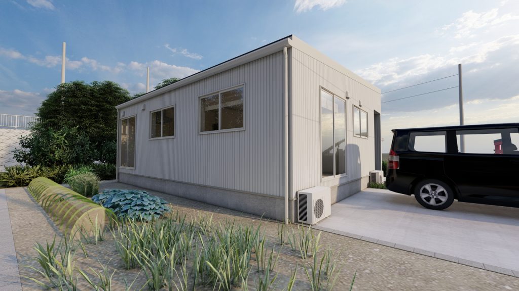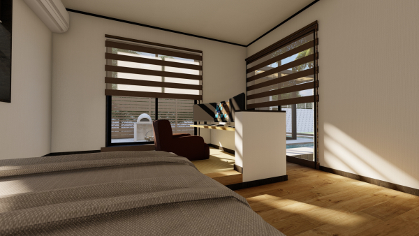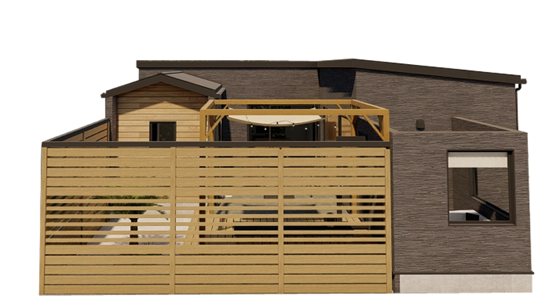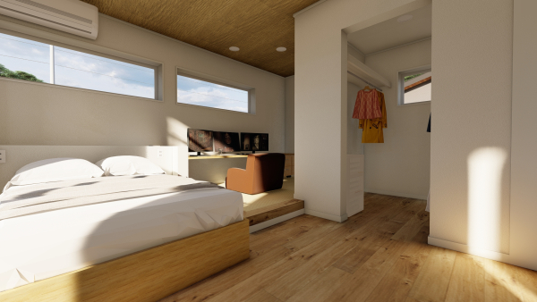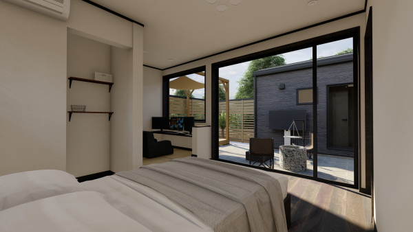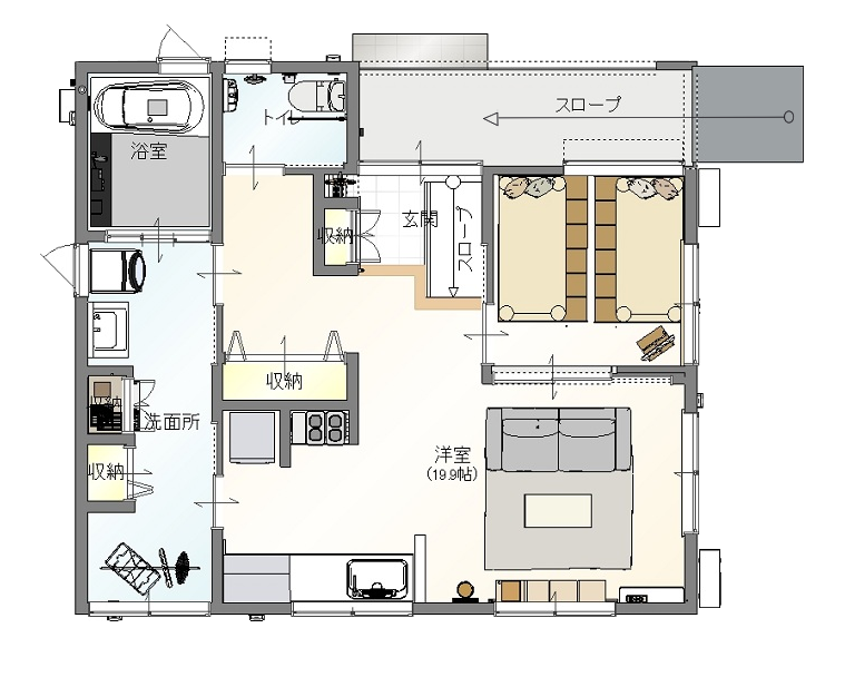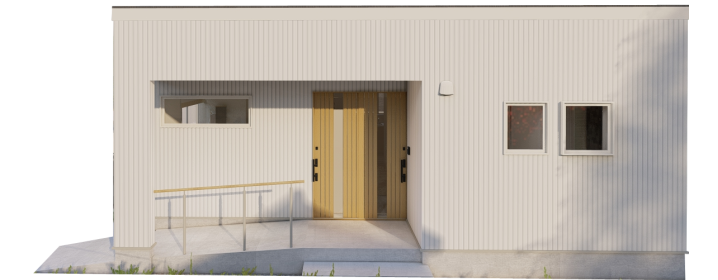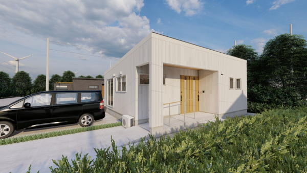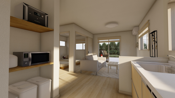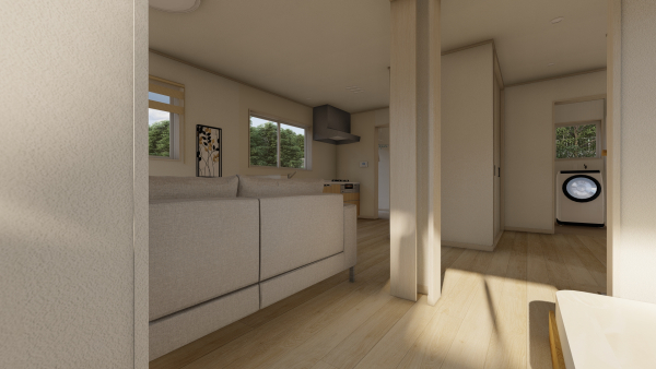 老後のライフスタイルをイメージした間取りで、玄関の内外にスロープ、寝室の出入口や廊下・バスユニットやトイレも通常よりも広く車椅子になった場合でも対応できます。通常時もキッチンから物干し場、洗面所と家事動線も良く、緊急際にポータブル電源で蓄電、AIスピーカーで暮らしの便利さも兼ねそろえた間取りです。