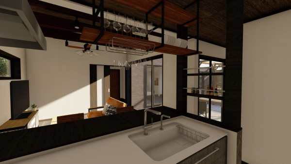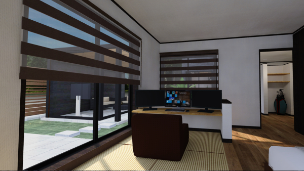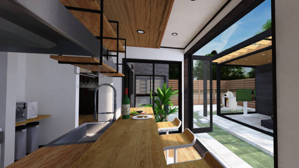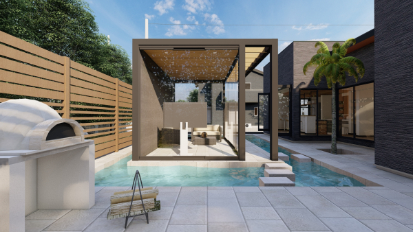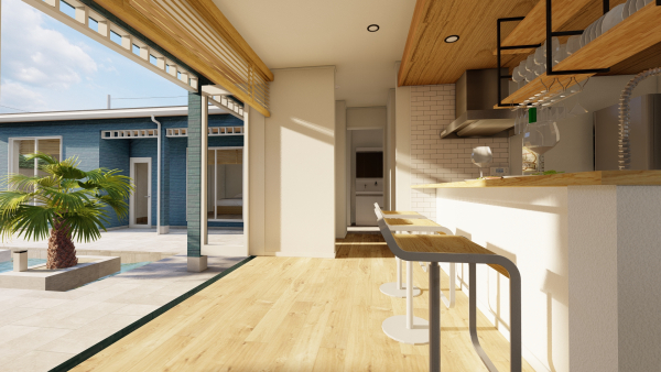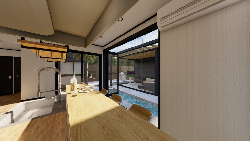 ガラスで覆われたテラス(LIXILプラスG)の廻りに池をつくり、くつろぎのスペースへ・・・キッチンのバーカウンターではお酒を楽しみながら、寝室は小上がりスペースでくつろぎながら庭が見渡せる眺めの良い間取りになっています。