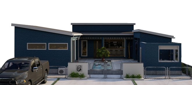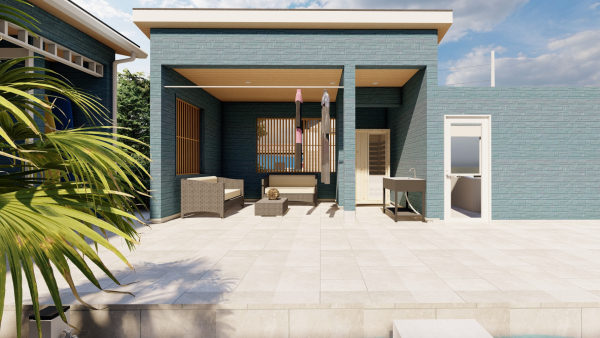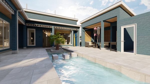居住スペースと親戚や友人など、皆が集まるスペースをあえて分けプライベート部分を見えなくし、海から帰ってきても庭で洗い流せるジャグジーやサーフボード置場、ウエットスーツを掛けられる所も事前に考えた間取りになっています。