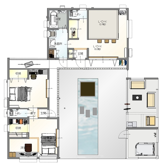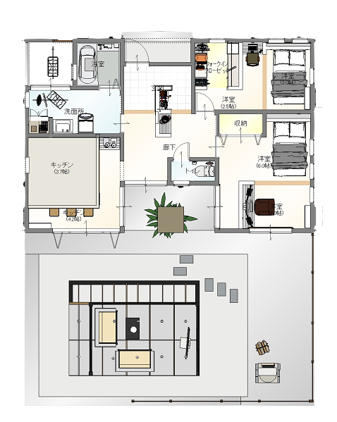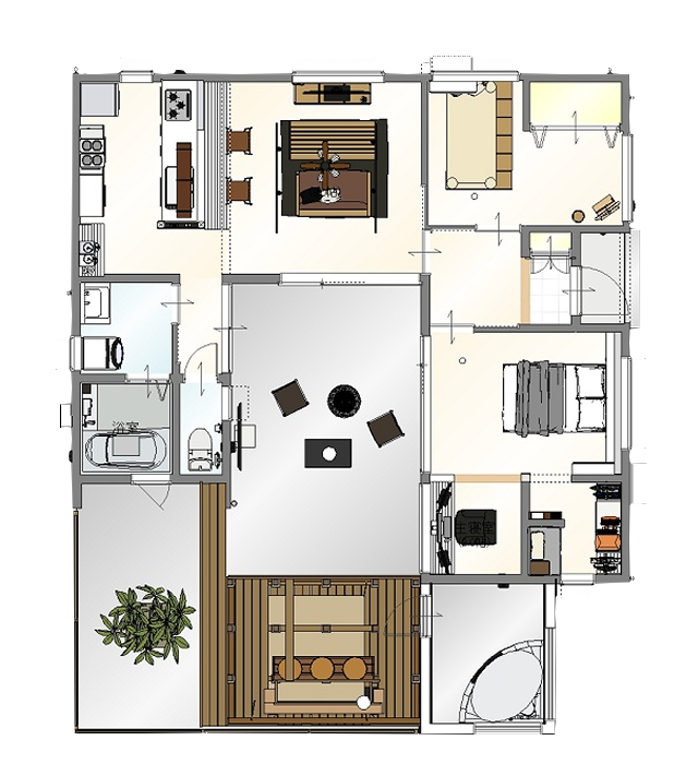 リビングや寝室から中庭が見渡せ、洗面所からも中庭に出入りでき、洗濯物も干しやすい間取りになっています。